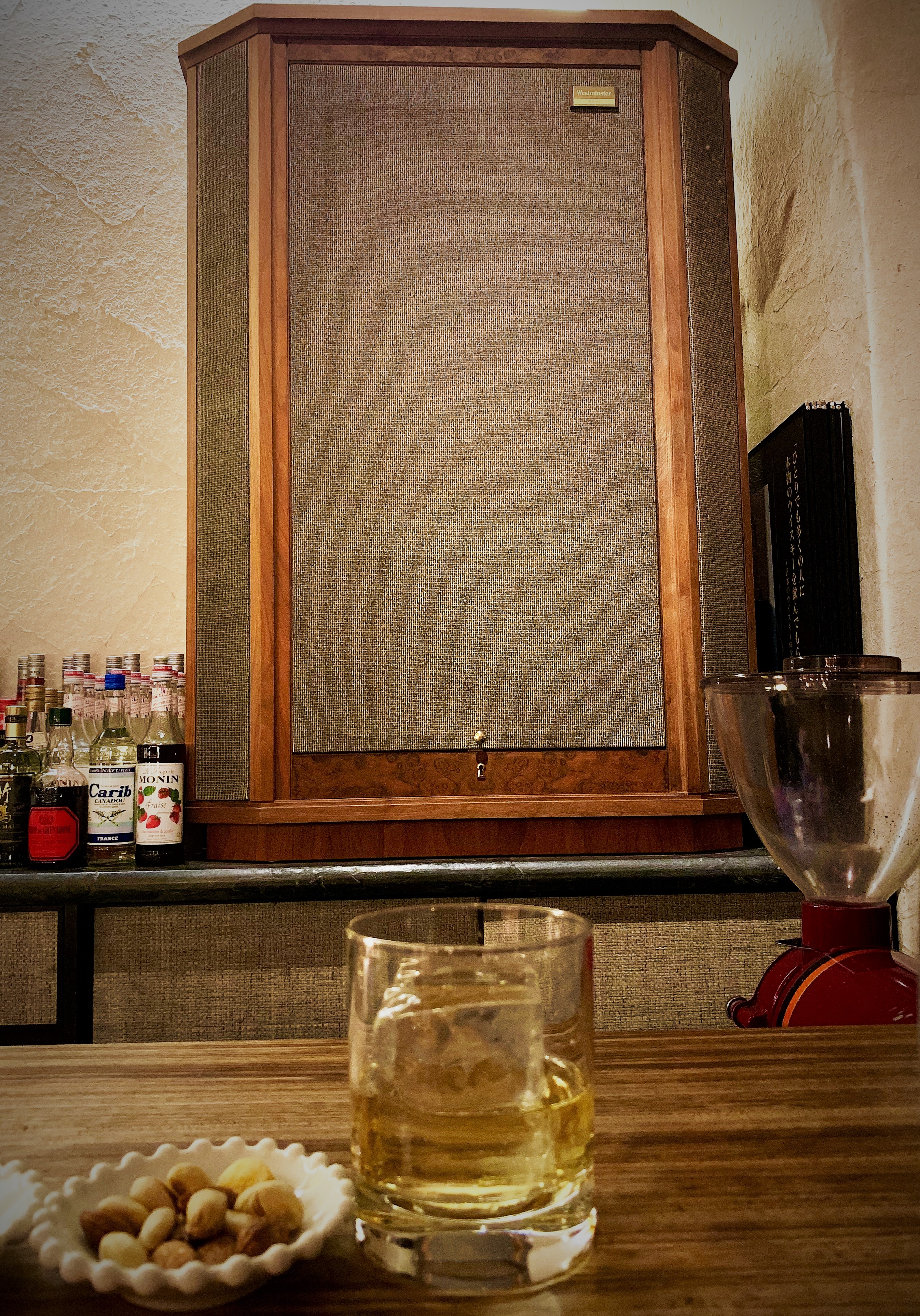 余談だが、昨日会社帰りにタンノイのウエストミンスターにマッキントッシュのパワーアンプがつながれているバーのカウンターで酒を飲んだ。スピーカー両方で350万、パワーアンプ2台、コントロールアンプ、CDを合わせると500万以上のオーディオ装置は見るにも美しく、それらを目の前に眺めながら飲むスコッチは旨い。鳴っていたのがエディ・ヒギンズのトリオものやスティーブ・キューンの亡き王女のためのパバーヌと、さもありなんというチョイス(ジャズバーではなくラウンジのような場所ということを考慮すると)であったがお店の雰囲気にはすこぶる合致している。音源がせめてCDであってほしかったが、どういうわけかMP3プレーヤーだったので音質が貧弱だったことが何とももったいない。音源のせいかタンノイはおとがくぐもっており、低音も薄っぺらかった。音の好みから言うと25分の1くらいの予算しか投じていないKEF Q350を配した我が超エントリーセットのほうが自分に合っている感じがした。 排気量の大きい車の惰性運転よりも小排気量の車がパワーレンジに入っている状態のほうが好みということだろうか。音のよいCDやアナログレコードを鳴らすと、ウェストミンスター様の印象も全く違ったものになると思うが、昨日は日がよくなかったかな。家に戻ってQ350 から鳴るケニー・バロン=マイナー・ブルースのピアノが生き生きと聴こえたこと!