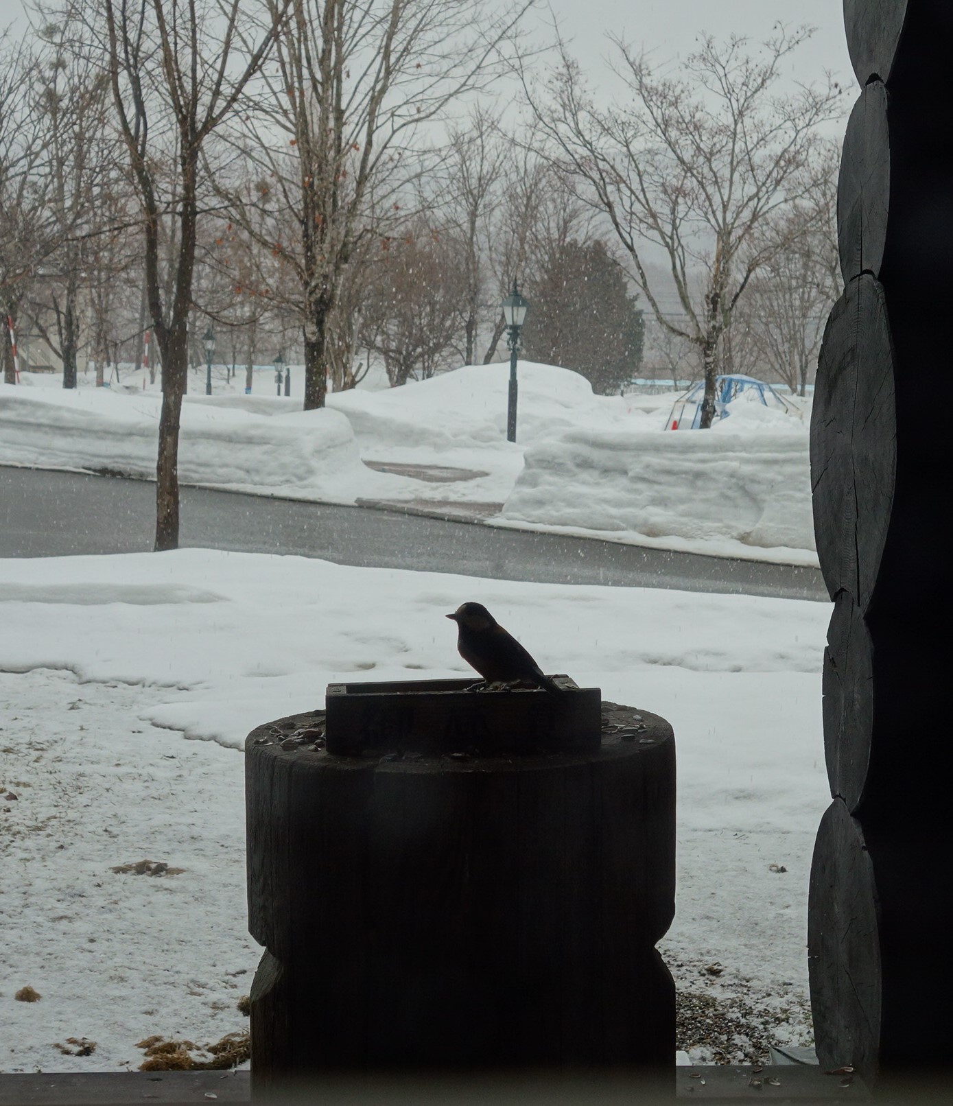 窓越しのバードテーブルには小鳥ちゃんが。