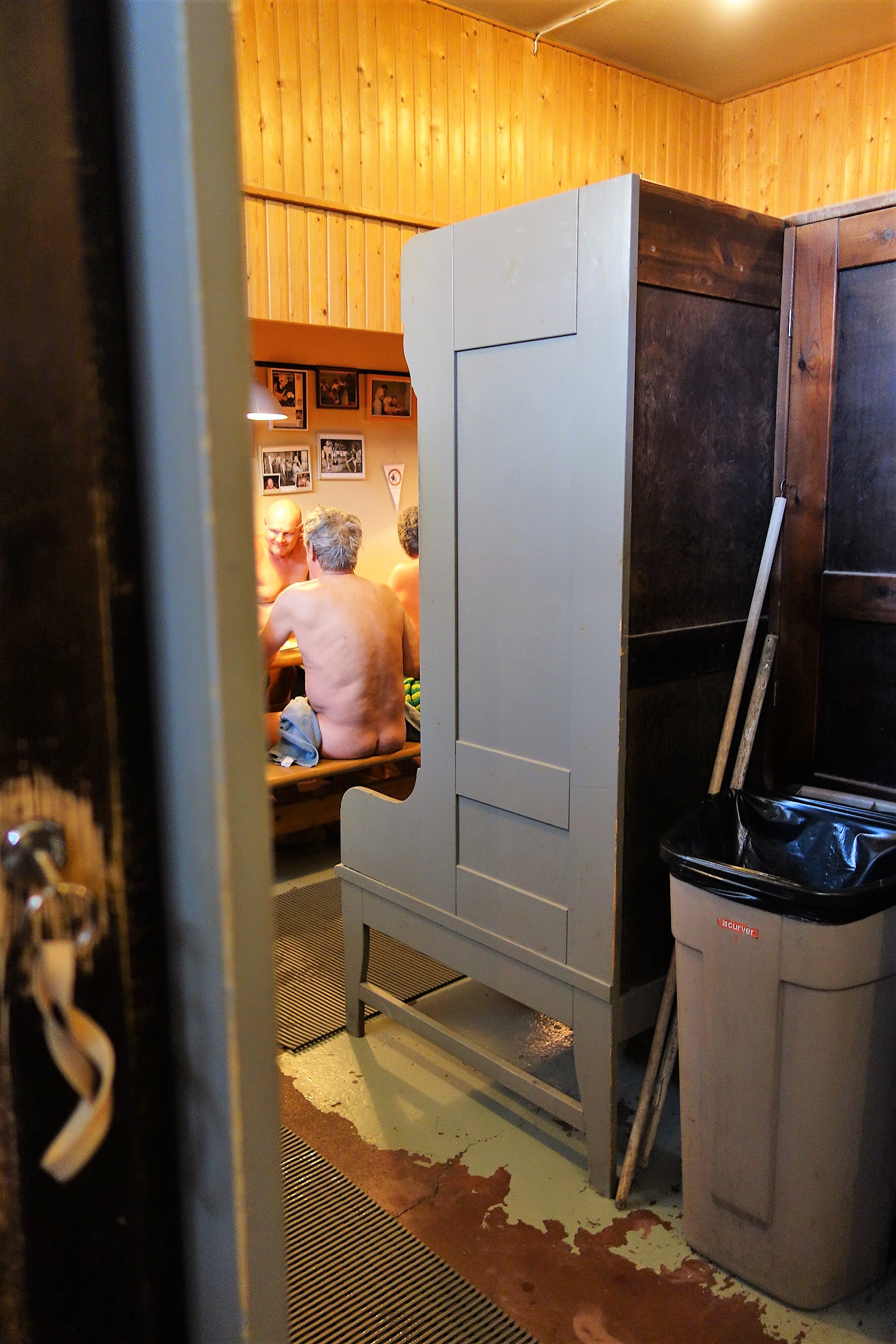 ムムム。そんなに広くはない。木のロッカーが年季を感じさせる。脱衣場にはテーブルが設えられており、男どもが酒を囲んで大声で話している。よく見るとカセットコンロに鍋をのせ、ぶっといソーセージを大量に煮ている。男たちの顔はカウリスマキ映画に出てくるそれそのものだ。
