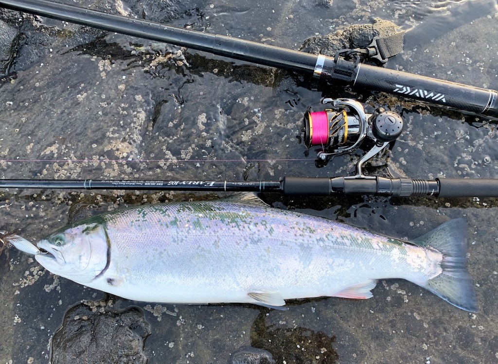 春先はサクラマスを追いかけた。サクラマスは航海型のヤマメで、これまでヤマメはたくさん釣ってきたのだが、釣りの対象魚としてサクラマスを狙ったのは今年が初めて。サクラを含むサケマスは河川で釣りあげることは禁止されていて(北海道ルール)、近所の発寒川にも遡上してくる光景を目にしていたが、もちろん狙ったことはなかった。正確に言うと、とある山上湖でワカサギ釣りをしていて、釣れたワカサギで試しに泳がせ釣りをした際にかけたことがある(湖上採取はOK)。食し、たいそう美味だった思い出があり、ショアからのサクラマス釣りに手を染めることにした。春先にそれ用のロッドとリールを購入し、積丹方面、石狩方面に通ったが、腕が無い自分はまぁ釣れない。サクラマスの釣りは大きいルアーを投げて釣るので、外道もなかなか掛からないため10回くらい丸坊主を食らった。4月下旬に大船遺跡を訪問がてら道南方面に家内と旅行をすることになり、当然のごとくタックルを携行した。家内が起きてこないうちにホテルを出ていき、函館の大森浜で竿を振ったが2日間何も起こらず。最終日に桜満開の熊石キャンプ場のバンガローに宿泊。早朝磯に出た。既に10人以上が竿を振っている中、唯一空いてたポイントは波をかぶっており、少々腰が引けたが、そこで開始。5投目でいきなり「ゴン」とアタリがあったがすぐさまルアーごと抜けてしまう。連戦でラインに傷が入っていたのだろう。気を取り直して投げ続けること30分、今度は大きなアタリ。フッキングを焦って大きく竿を立てたところ、痛恨のばらし。さらに15分後にルアーがひったくられる。今回はドラグを緩め、多少走らせてから引き寄せ、隣のアングラーにタモを手伝ってもらい無事ランディング。人生初のサクラマスは59.5cm3キロのメタボな雌。無事、ヤマガ・アーリーとツインパに入魂できた。脂がのったハラスのルイベは超絶美味だった。