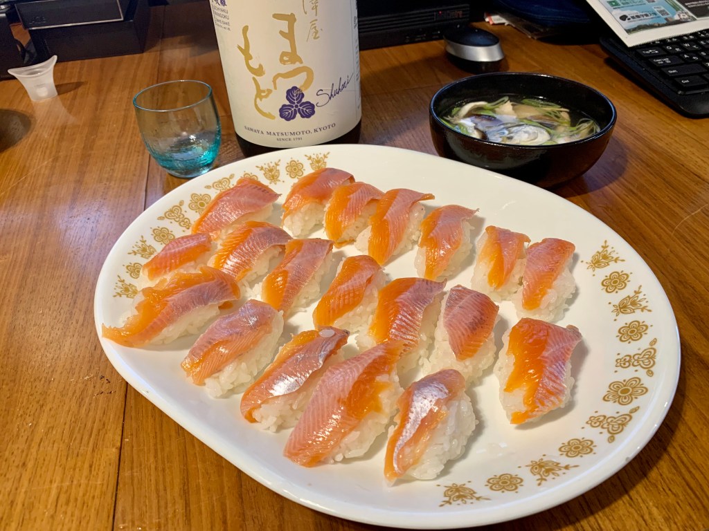 どうしてもヒメマスを釣ってみたくなり、6月初旬には洞爺湖に2回行った。洞爺湖では6月だけボートでの釣りが許されていて、1,200円の遊漁券を購入すれば自艇から釣りができる。ここ数年乗っていなかったカヤックを実家の車庫から引っ張り出してきて、あれこれ作戦を練り、いざ出陣。支笏洞爺のベテラン勢は太鼓リールを使いドジャーにルアーを付けたトローリングが定番なのだが、こちらはそんな大層な道具は持ち合わせていない。カヤックを沖100mくらい出して、アジ用のサビキを振ったり、小さめのスプーンを投げたりと試行錯誤を繰り返す。1回目の単独行ではまぐれで2尾かかり、2回目は家内と2人で3尾のみ。やはりヒメマスは専用の道具がないと厳しい。2回目の釣行で我々のカヤックの近くをトローリングしていた動力船の船長が、あまりにも釣れていないオーラが出ていた我々を不憫に思ってくれ、岸にカヤックをつけた際に「俺、こんなに釣っても食えないから、持っていきな」と長いたも網に入れてくれたヒメマスを6尾授かった。船長は60尾以上釣ったとのこと。いただいたヒメマスはどれも25~30CMと大型で、脂乗りが良く、食味も抜群であった。今回自分で下手な寿司を握ったが、魚がいいのですこぶる美味。お造り、塩焼きもうまい。以前ススキノの居酒屋でヒメマスの握りを食ったことがあるが、2貫で800円だったような。ヒメマスは淡水魚で一番おいしい魚だと思っている。