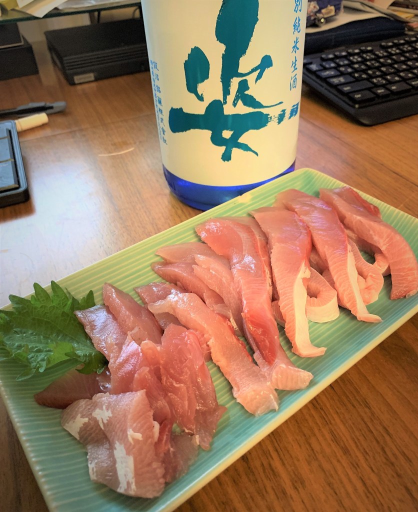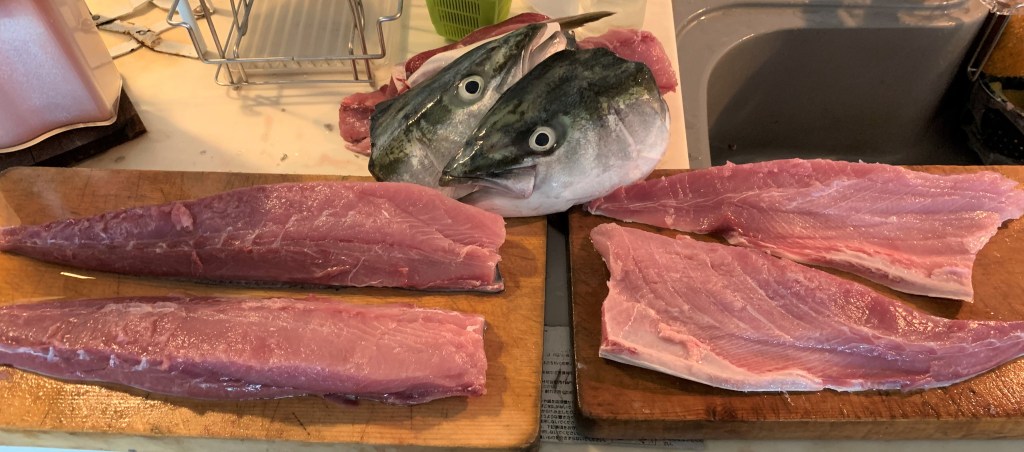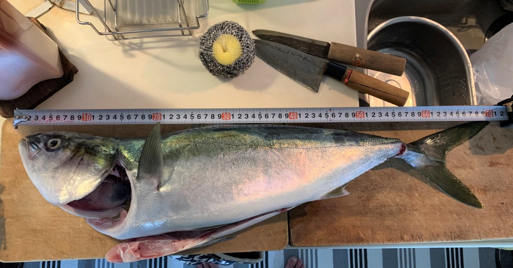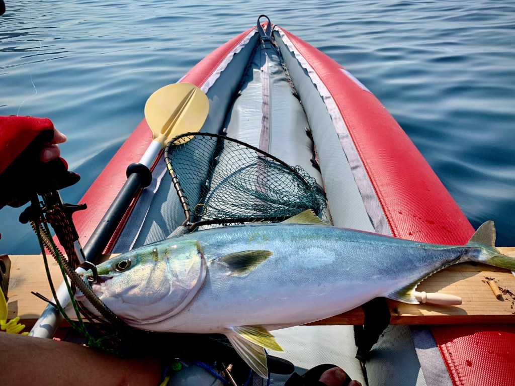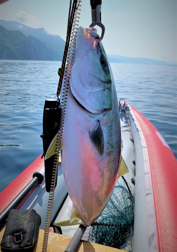 これまで使っていたカヤックは10年近く、主に川下りで酷使してきたため、水漏れが発生しており6月に中古でインフレータブルの新艇を購入。米国AIRE社のスーパーリンクス号である。名付けて超山猫艇(直訳)。これがえらく頑丈な船でセルフベイル機能(浸水を自動で船外に配水する機能)も備わっており「これなら沖に出られるで~」と本格的にシーカヤックフィッシングを始めることに。スケグ(フィン)を付けたり、ロッドホルダー等の艤装品を廃材あつめてDIYして作成。早速、7月の波風が穏やかで、潮の流れもきつくない日にソロで積丹の海に出艇。狙うは上向き調子のブリ。出艇場所から2KMくらい漕いで、神威岬周辺のポイントへ向かう。カヤックの周りのあちらこちらでベイト(小魚)が沸き立ち、それを捕食しに大量のブリが海面をはねている。船の真下を100尾くらいいようかというブリの大群が行ったり来たりしている。エンドウクラフトの160G代表ジグを落とし、着底を確認後ワンピッチでしゃくり始めると「ドーン」と大きな当たり。ドラグを緩めておいたので、魚が走り出しラインが出っぱなしになる。ポンピングして巻き取ろうとするも、魚にトルク負けして全然上がってこない。竿を立てて、1M巻いては2Mラインを出されるというようなやりとりを15分ほど。その間、超山猫号は2,300M沖に引っ張られ、魚もさすがに体力を失ってきたようで、徐々にリールを巻けるようになった。水面に顔を出したのは念願のブリ。70CM5キロ弱の魚体は正確にはワラサになるのだろうが、まるまると太った魚体はブリにしか見えない。船上で活締め血抜きを行い、6時間後にはブリ大根、カマ焼き、お造りに姿を変え、家内と私の胃袋に収まってくれた。翌日の漬け丼も美味かった。全て絶品だったが、ブリ嫌いの家内が刺身を絶賛していたくらい美味い魚だった。