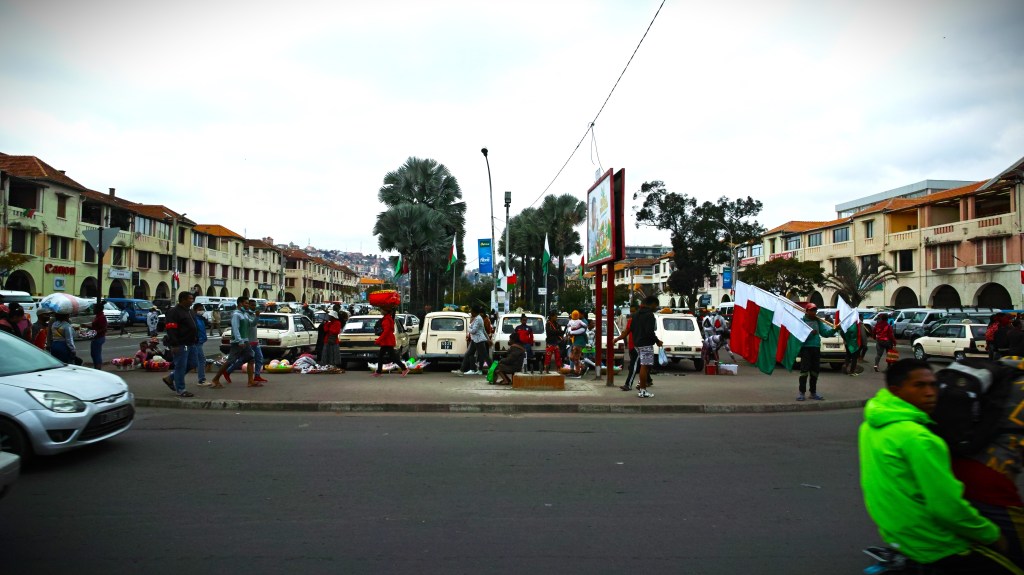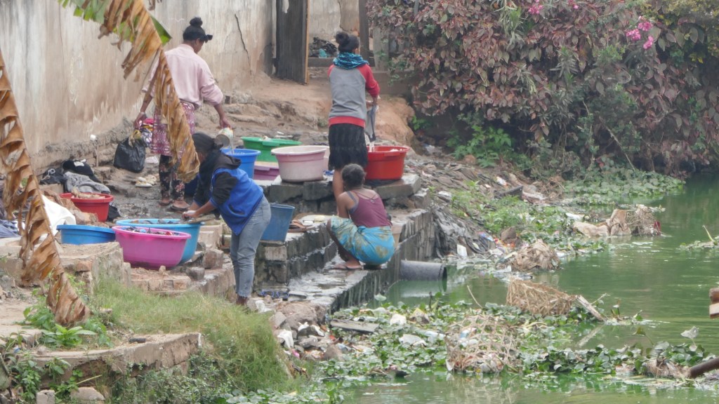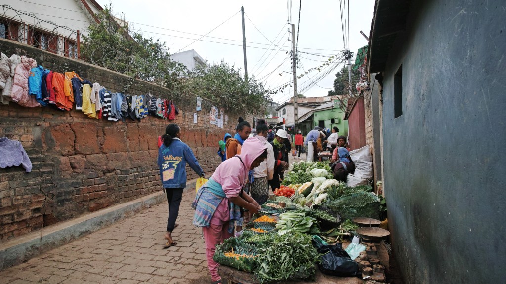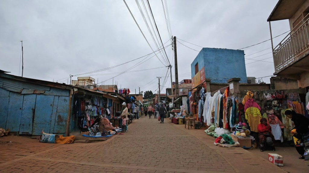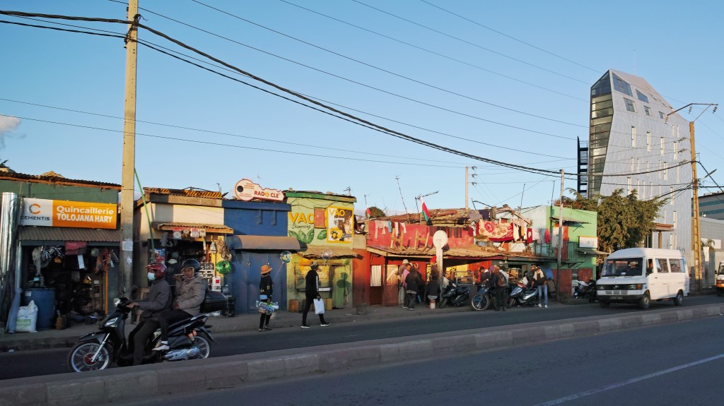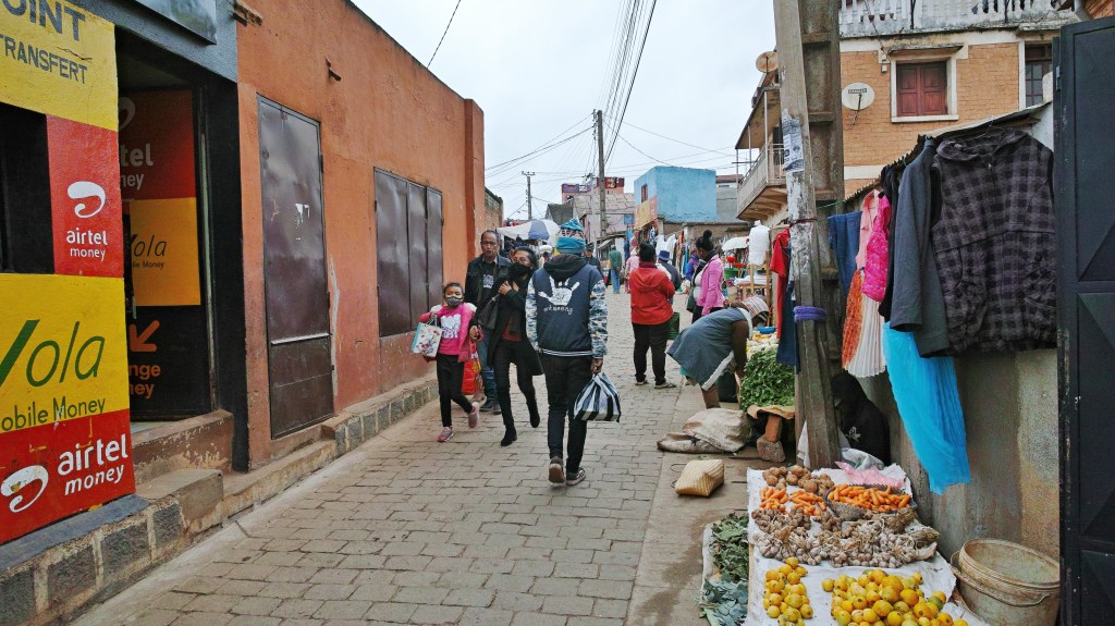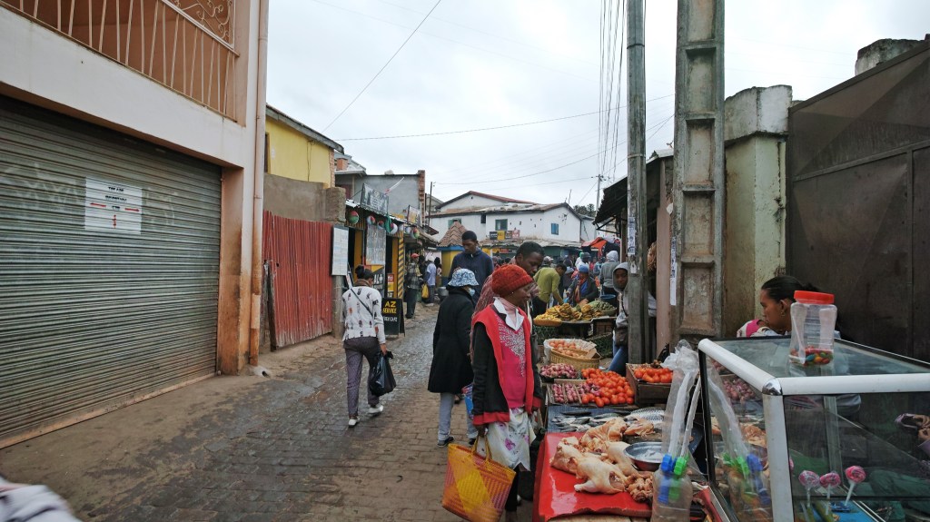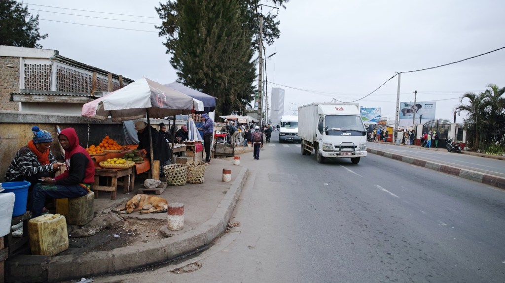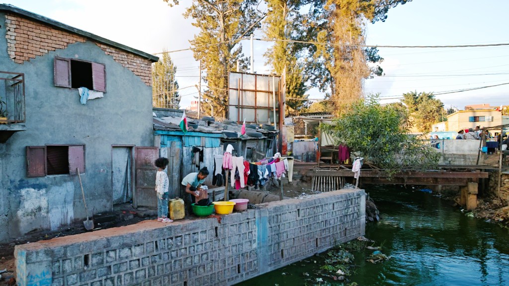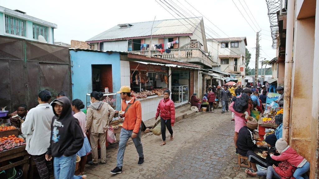 マダガスカル国のGNI指数は161か国中下から3~5番あたりを行ったり来たりしており、世界最貧国の一つに数えられ貧困率は人口の約 8 割にのぼる。短い滞在の中でも、その貧しさに目が行ってしまう場面に数多く遭遇した。ホテルの近くには多数のホームレス、物乞い、ストリートチルドレンがいて、彼らよりも暮らし向きが少し良い人たちが通り沿いにスラム街を形成している。汚染されてエメラルドグリーン色に変わった川で女たちが洗濯し、裸足の子供たちがお金をせびって50メートルくらいついてくる。中通りに入ると露天商が立ち並び、肉や魚や野菜を売る人々が通りを埋めつくし、ニワトリやカモや野良犬や猫がそこかしこで闊歩している。慎ましさの中でたくましく生きている人々の穏やかで明るい表情が眩しい。