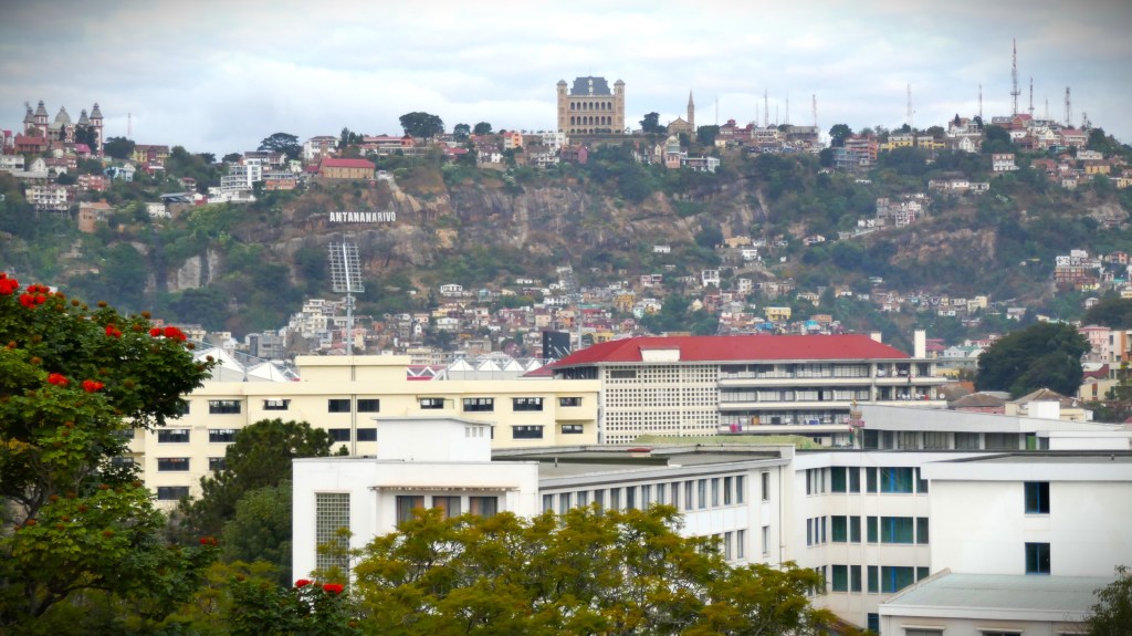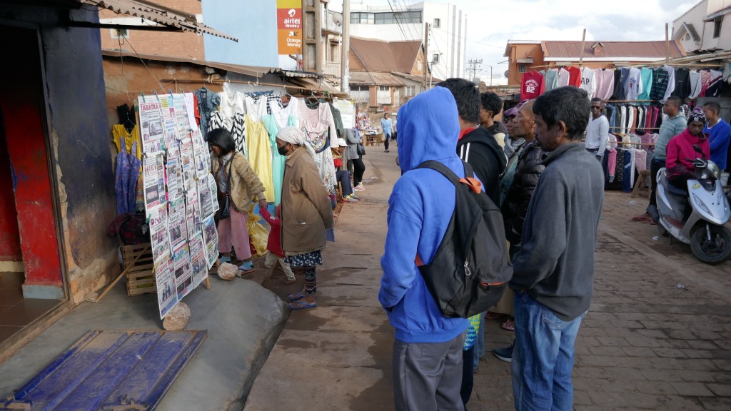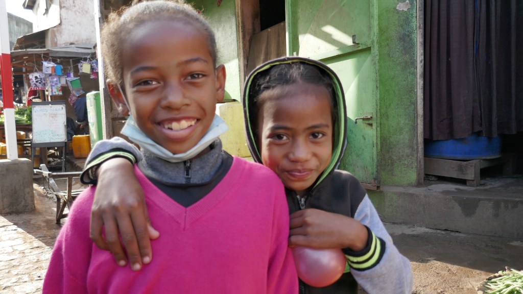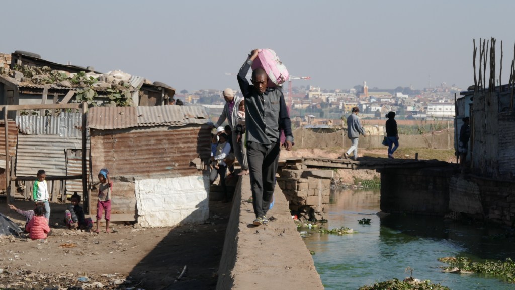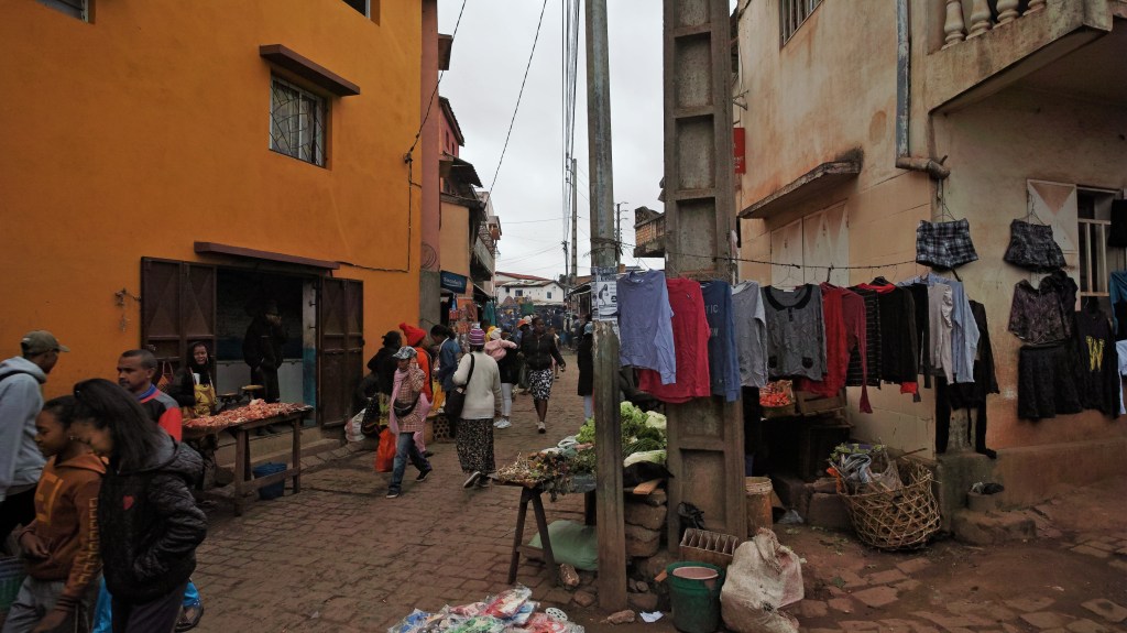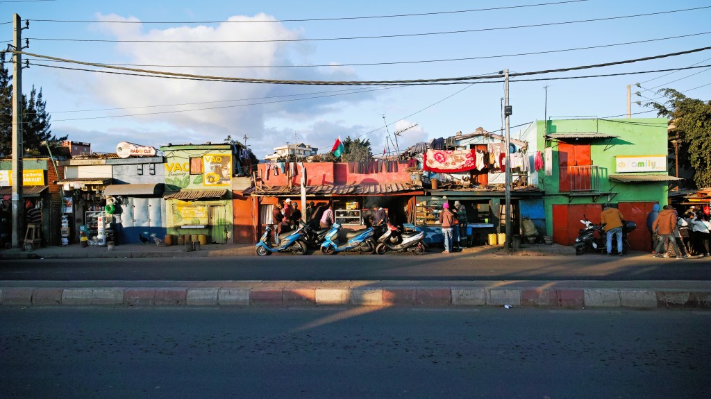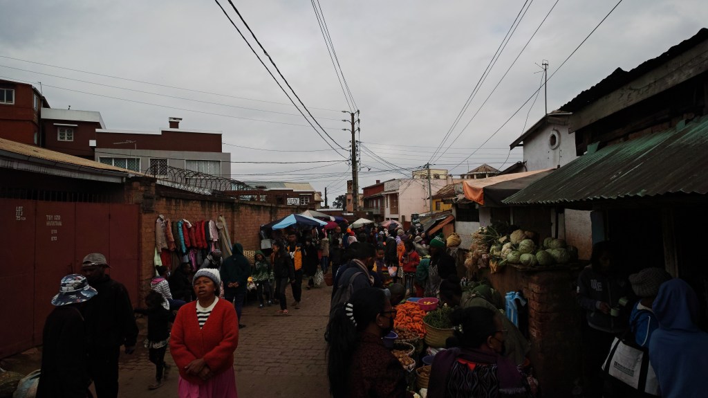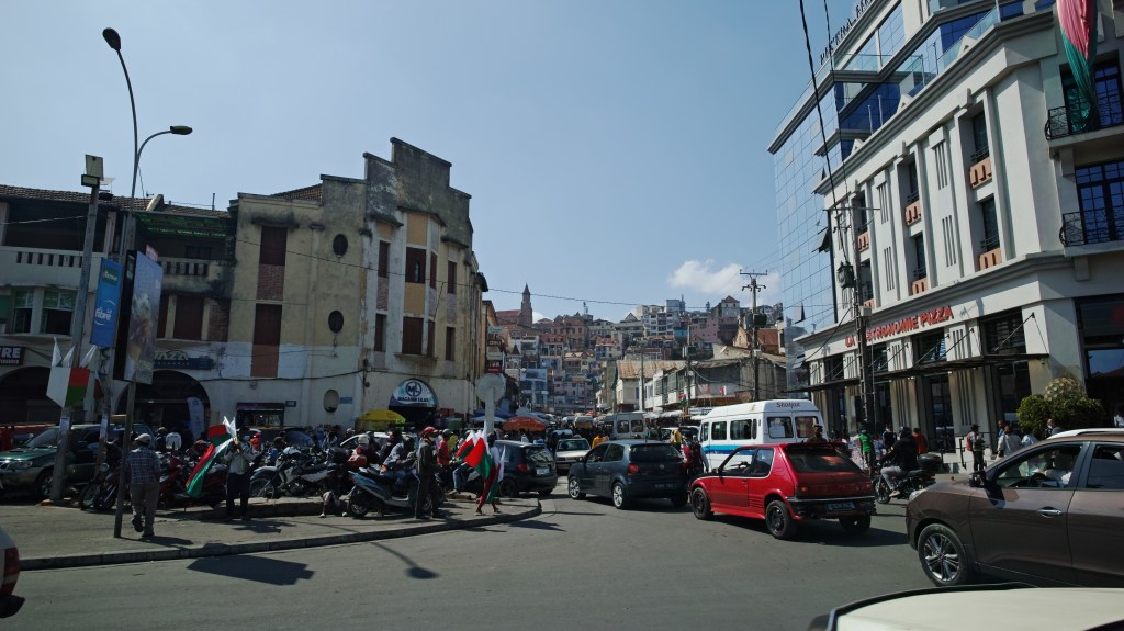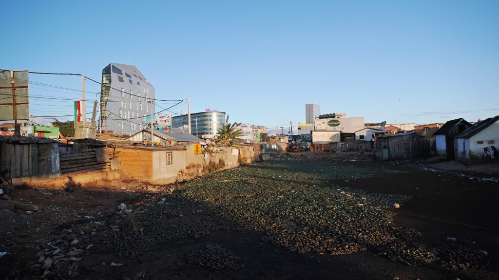 マダガスカル国のGNI指数は161か国中下から3~5番あたりを行ったり来たりしており、世界最貧国の一つに数えられ貧困率は人口の約 8 割にのぼる。短い滞在の中でも、その貧しさに目が行ってしまう場面に数多く遭遇した。ホテルの近くには多数のホームレス、物乞い、ストリートチルドレンがいて、彼らよりも暮らし向きが少し良い人たちが通り沿いにスラム街を形成している。汚染されてエメラルドグリーン色に変わった川で女たちが洗濯し、裸足の子供たちがお金をせびって50メートルくらいついてくる。中通りに入ると露天商が立ち並び、肉や魚や野菜を売る人々が通りを埋めつくし、ニワトリやカモや野良犬や猫がそこかしこで闊歩している。慎ましさの中でたくましく生きている人々の穏やかで明るい表情が眩しい。