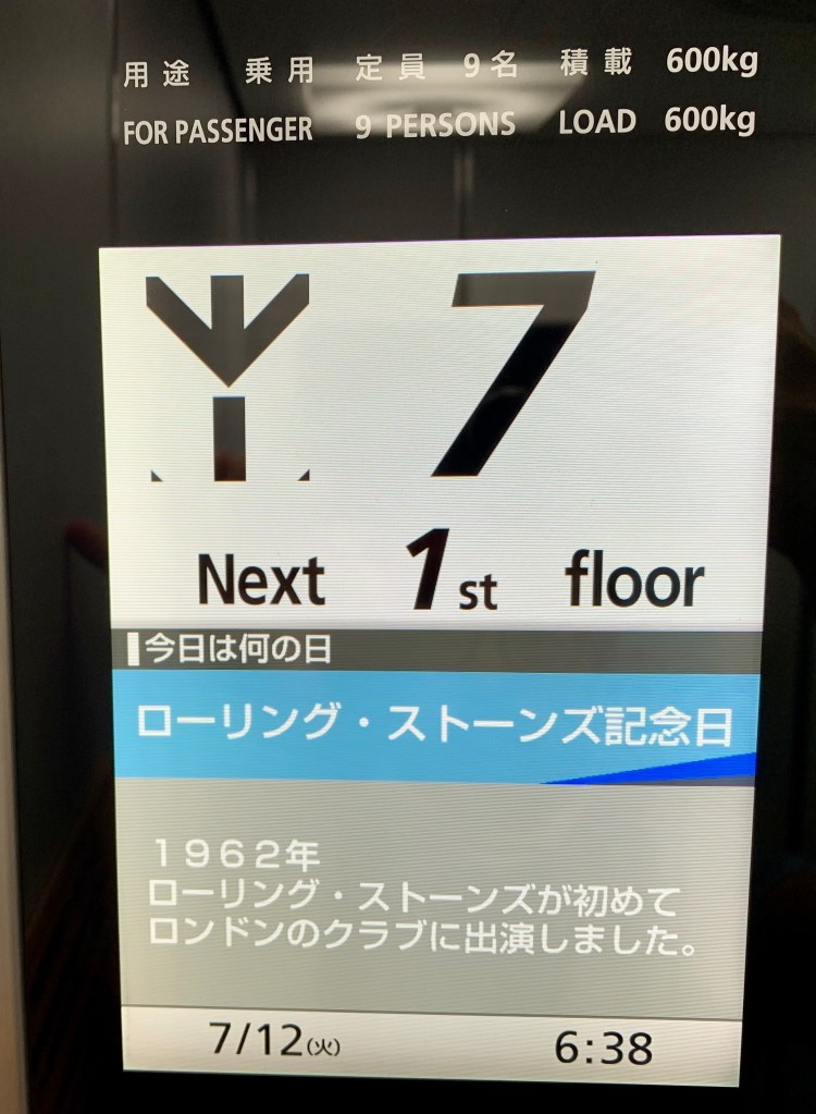 早朝ごみ捨てのためにエレベーターに乗ると、モニターに「今日はローリング・ストーン記念日」と表示されていた。1962年(昭和37年)のこの日、イギリスのロックバンド、ザ・ローリング・ストーンズ(The Rolling Stones)がロンドンのクラブに初出演したとのこと。
