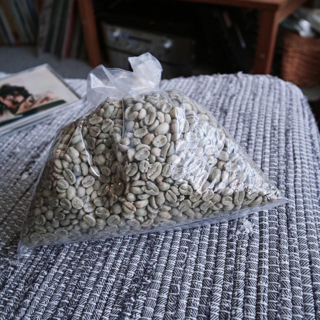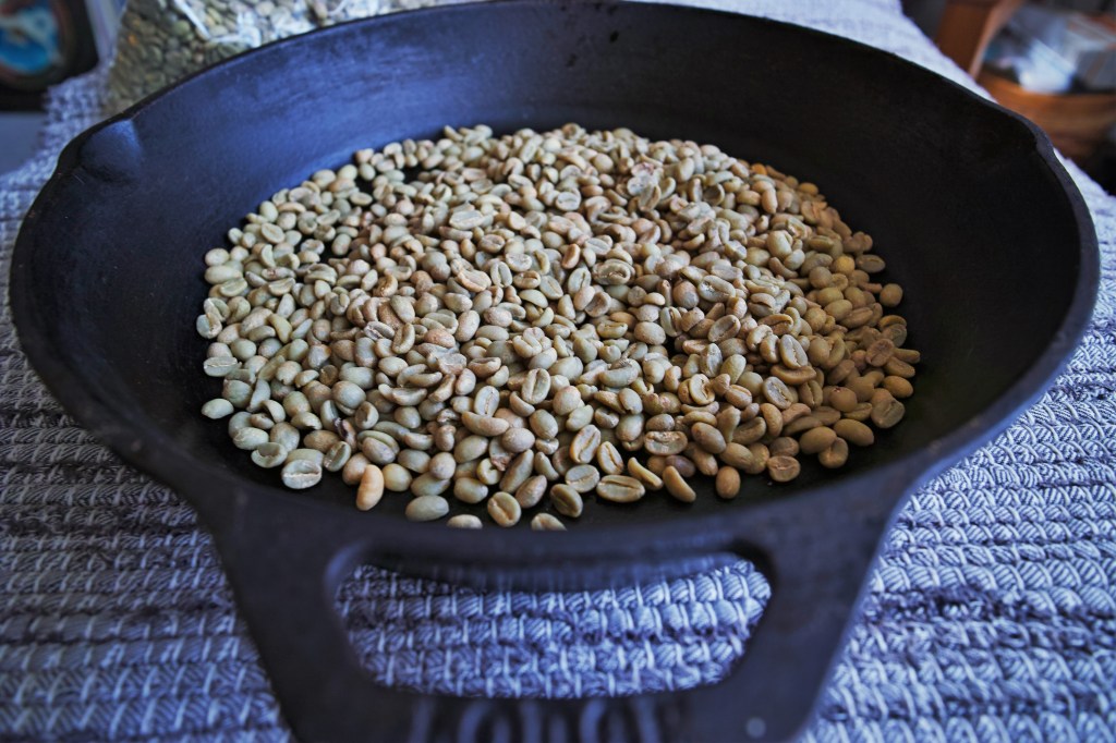 生豆からコーヒーを焙煎し、挽いて飲むというのは初めてだったので、インターネットで色々と調べたところ、家にある道具で一連の作業ができそうだということが分かった。生豆は薄緑色で、表面に薄く蝋が塗られているような見栄え。鼻を近づけてみても、コーヒーの香りは全くせず、無臭である。通常、焙煎は温度管理ができる自動焙煎機や、ビンゴゲームのナンバーボールを回すような鉄網製の手動焙煎機で直火にかけて行うようだが、そのような道具は無いので、料理に使う厚手の鋳鉄製のスキレットで焼くことにした。