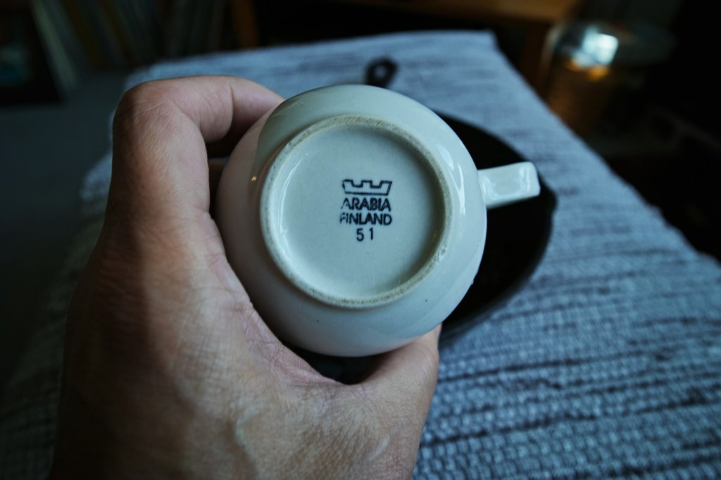 こうなってくると、コーヒーカップにもこだわりを見せたくなってくるが、ソーサーの付いた高級なコーヒーカップなどはうちにはない。これは普段使っている、ARABIA社のコーヒーマグを使おう。出張でヘルシンキのIttala社へ取材に行った際に、ビンテージ品フェアをやっており、形が気に入り、重いのに買ってきた愛用品である。定石どおり、お湯を入れてカップを温めておく。
