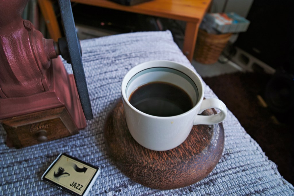 深煎りが好みなので、しつこく熱し続け、爆ぜる音が完全になくなったころ合いを見計らって、スキレットを火から下ろした。つやつやとした豆から少しだけ煙が立って、いい香りがする。ネットの指南書に拠れば、十分冷ましてから豆を挽くことが重要とのことで、すぐに挽きたい気持ちを押さえて待つこと1時間。普段は電動オートミルを使用しているのだけれど、生豆から焙煎した初めてのコーヒーということで、久方ぶりに手挽ミルを登場させることにした。ゴリゴリと挽くたびに乾いたコーヒーの香りが立つ。