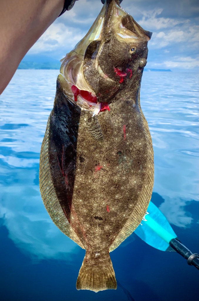 昨日は朝7時出艇。若干出し風、波は0.1M、気温30度、晴れ、うねり無し。カヤックを漕ぐ条件としては最高なのだけど、魚的には海がもう少し動いていた方が良い。漕ぎ出すと、汗が噴き出してくる。涼どころか、照り返しが酷く、地上よりも日射が厳しい。20MラインでTGベイト60Gを落とすも、無反応。40メートルラインまで漕ぎ出し、魚探に若干反応あり。TGベイトを落とし底を探るとググっと反応、即合わせで上げると、ここではアベレージサイズのヒラメ。45CMにしては、身厚で身も固そうなので、キープ。すぐさま、もう一投。またかかる。1枚目よりもかなり引きが強く、ゴーマル(50CMオーバー)もらった!と思いきや、さらに身厚のヒラメさん。全身筋肉質のマッチョな46CMで引きの強さに納得。まだ10時前だったけど、風が出てこないうちに撤収を決め、沖2.5Km地点から一気に出艇場所まで戻った。