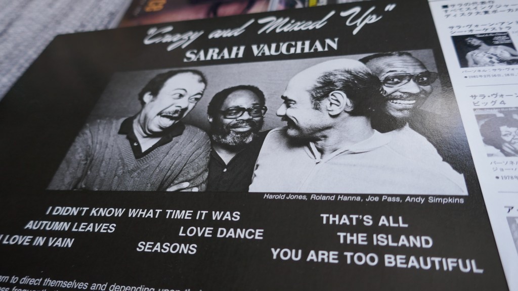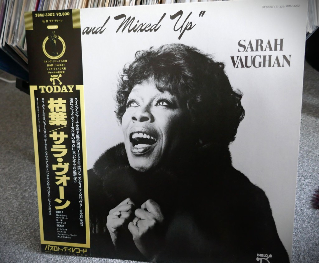 Crazy and Mixed upはVaughnにとってPabloから最後に出すレコードとなりました。彼女としても、本作以降オリジナルアルバムはThe Planet Is Alive…Let It Live!と前述のBrazilian Romanceの2作しか出しておらず、本作は長いVaughan創作の歴史の終盤を飾る名盤として知られています。似た味わいのジャケットを持つHow Long Has This Been Going On(1978)がOscar Peterson Trioと演っているので、そちらの方が注目されているかもしれませんが、本作はセルフプロデュースであることに加え神がかった歌唱を堪能できる素晴らしい出来栄えです。CDで長らく愛聴してきましたが、中古邦盤を見つけたのでついつい買ってしまいました。本作はVaughanの多少力が抜けたような感じで歌う”I Didn’t Know What Time It Was”で幕を開けますが、これぞ完璧なJAZZボーカルという佇まいで名盤の予感が広がります。Pabloの申し子Joe Passの控えめなギターも素晴らしく、Vaughanの歌唱を引き立て、作品を盛り立てています。この路線が続けばいいなと思ってしまうのですが、本作品でもっとも有名な3曲目”Autamn Leaves”でその期待は裏切られます。全編を歌詞無しのスキャットで歌いきる、そこが素晴らしいと賞賛を受けている作品で、確かに凄いのですが力の抜けたVaughanの歌唱の魅力をもっと聴いていたいという願望はここで終わってしまいます。邦盤タイトルが枯葉とされていることからも、多くの聴き手に取ってこの曲がメインディッシュとなっているのかもしれません。“Love Dance”、”The Island”とブラジルのIvan Linsが作曲陣に名を連ねていますが、ブラジルっぽさは微塵もありません。一曲くらいラテンのリズムが入っていても変化球となってよいのではと思ってしまいますが、直球勝負でVaughanは聴くものの耳を惹きつけ続けます。本作はJerome Kernのスタンダード曲You are too beautifulで幕を閉じますが、Jazz ボーカルアルバムはこうであるべき、という陰りと多幸感を余韻に残す名歌唱となっていると思います。