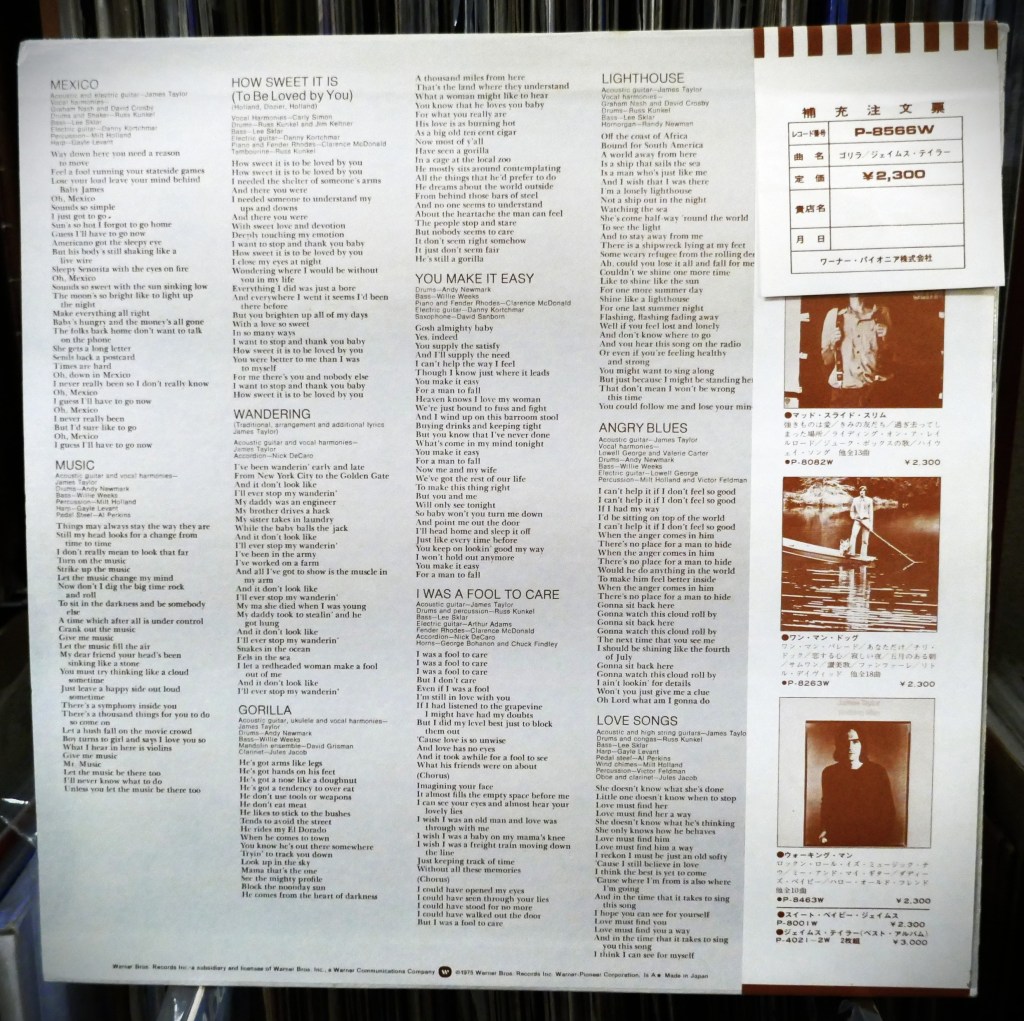 シングルはマービンのカバー曲How Sweet it is で、スマッシュヒットを記録しています。ただ、アルバムのトーンを決定付けているのはA1,A2の流れだと思います。A1ではCrosby&Nashがコーラスを付けていています。A2は軽いソウルミュージックの乗りですが、Andy Newmarkのドラムと、Willie Weeksの安定感あるバックでずっと聞いていたくなるような心地よさです。Carol KingのMusicとは同名異曲です。この曲を貼り付けておきます。