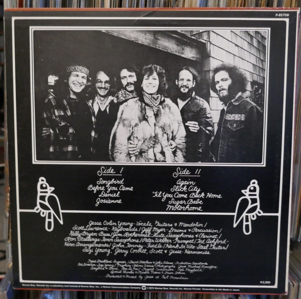 先月83歳で鬼籍入りしたJesse Colin Young(JCY)ですが、ラジオで追悼特集され、かけられていたSunlightを聴いてとてもよかったので、先週中古盤を見つけて、つい手を伸ばしてしまいました。お目当てのSunlightは収録されていませんが、JCYのソロアルバムでは一番売れたSongbirdです。売れたと言ってもビルボード最高順位が26位ですので、ほどほどに売れたということでしょう。人気がないのか、1,000円でおつりが来ましたね。